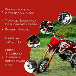 Mini moto 49cc 2 tempos a gasolina, recomendada para crianças de 4 a 9 anos, suportando até 60kg. Estrutura em aço com carenagem plástica, freios dianteiro e traseiro a disco e velocidade máxima de 40 km/h. Tanque de 1,5L. Vai quase pronta para uso, sendo necessário apenas instalar a roda dianteira e apertar alguns parafusos. Conta com dispositivo de segurança que desliga ao puxar a alça presa ao piloto.