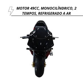 Com a Mini Moto Racer 49CC a criançada vai se divertir pra valer! A Mini Moto possuí motor 2 Tempos de 49cc que permite uma experiência única e verdadeira pra as crianças e atinge velocidade máxima de 48 km/h. É recomendada para crianças a partir dos 4 anos e que pesem até 55 kg. Conta com freio a disco nas duas rodas, pneus para asfalto e tanque para até 1 litro de combustível.