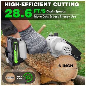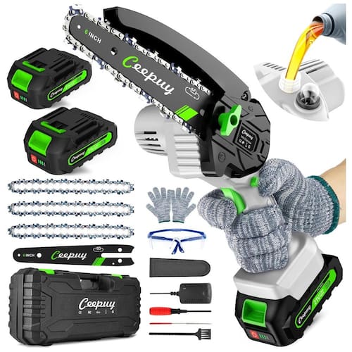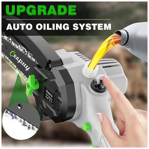 A mini motosserra sem fio Ceepuy é uma ferramenta portátil e elétrica de 6 polegadas, equipada com um motor atualizado de cobre puro de alta eficiência de 880 watts, capaz de cortar um tronco de 6 polegadas de diâmetro em apenas 8 segundos. Além disso, vem com um sistema de ajuste automático de corrente e enchimento automático de óleo, que reduz o desgaste para cortes mais suaves e menos uso de energia. A mini motosserra também possui duas baterias recarregáveis de lítio de alta energia de 21 V e 2000 mAh, que duram cerca de 3040 minutos com uma carga rápida de 1,5 hora.