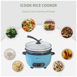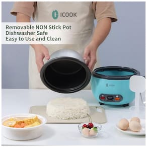 Mini Panela de Arroz Elétrica ICOOK 110V, capacidade até 3 xícaras não cozidas, função automática de manter aquecido, pote interno antiaderente, tampa de vidro temperado e acessórios inclusos.Lâmpada piloto