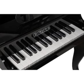 Piano de cauda acústico infantil com 30 teclas turbinho O mini piano de cauda turbinho, foi desenvolvido para despertar os dons naturais do “pequeno” músico. Extremamente resistente ele é todo construído em madeira, com uma acabamento impecável, laqueado em alto brilho, finaliza a montagem todas as travas, buchas e parafusos em aço garantem a robustez desse piano.