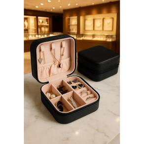 Prático e versátil, este porta-joias na cor preto combina funcionalidade e estilo minimalista. Com medidas de 10 cm de altura por 10 cm de largura, é ideal para o uso diário e perfeito para levar na bolsa, mochila ou mala de viagem. Seu design compacto remete à simplicidade elegante, enquanto o armazenamento interno é ideal para organizar joias de médio e pequeno porte, como anéis, brincos, correntes e pulseiras.