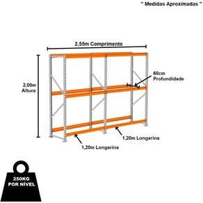 Mini Porta Pallet 250kg 1 Inicial 1 Continuação 2,55m Comprimento - 2,00m x 1,20m x 60cm Amapá O Mini Porta Pallet é produzido em aço resistente, com capacidade de 250kg POR NÍVEL e reforço nas laterais é indicado para depósitos, estoques e exposição, como: pet shops, oficinas, lojas de materiais de construção e mini atacarejos. Prático e versátil dispensa o uso de empilhadeiras, onde as mercadorias são depositadas e retiradas manualmente. Além disso, é de fácil montagem, com a simples colocação de porcas e parafusos, unindo as longarinas às colunas. A pintura dos produtos é feita por meio da técnica eletrostática, com tratamento anticorrosão uniforme e resistente. Os Mini Porta Pallets possuem qualidade, resistência e durabilidade garantidas pelo uso de matérias-primas de alto padrão, processos produtivos com a mais alta tecnologia do mercado e um cuidado especial em cada etapa de produção. Dimensões Aproximadas Altura: 2,00mProfundidade: 0,60mComprimento Longarina: 1,20m Comprimento Total Montada: 2,55m " Medida Aproximada " Características Material: AçoMarca: AmapáCor: Cinza/LaranjaCapacidade por Nível: 250kgCapacidade Peso Total: 1500kg Mini Porta Pallet Inicial possui 02 laterais, indispensável para iniciar uma fileira. Mini Porta Pallet Continuação possui 01 lateral, utilizado para dar continuidade à fileira e não pode ser montado individualmente. Contém 03 Laterais 2,00m x 0,60m - Amapá06 Pares Longarinas 1,20m x 0,60m - Amapá Entrega Via: TransportadoraPrazo: Consulte pelo CEP com nossos vendedores Garantia Contra Defeitos de Fabricação: 12 meses DevoluçãoEm até 7 dias após a chegada do produto, você tem o direito de realizar a devolução. Mas para isso, a mercadoria não deve ter sido montada, utilizada e danificada.Horário de AtendimentoSegunda a Sexta-feira, das 13:00h às 17:00h.Dúvidas, Informações, Consulte Nossos Vendedores Via WhatsApp.\nFicha Técnica\nCódigo AMP0165\ncódigo de barras 7899119800327\nModelo Linha Mini Porta Pallet 250kg\nCategoria Mini Porta Pallet Amapá\nMarca Amapá Metalúrgica\nItens Inclusos 03 Laterais 2,00m x 0,60m - Amapá06 Pares Longarinas 1,20m x 0,60m - Amapá\nGarantia 1 ano após o recebimento do produto\nDisponibilidade Disponível em 2 dias úteis\nInformação adicional Dúvidas, Informações, Consulte Nossos Vendedores Via WhatsApp.