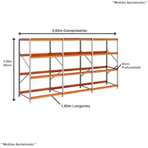 Kit Mini Porta Pallet 250kg 1 Inicial 2 Continuação 5,60m Comprimento 2,00m x 1,80m x 60cm - 4 Níveis - Amapá O Mini Porta Pallet é produzido em aço resistente, com capacidade de 187,50kg por nível e reforço nas laterais é indicado para depósitos, estoques e exposição, como: pet shops, oficinas, lojas de materiais de construção e mini atacarejos. Prático e versátil dispensa o uso de empilhadeiras, onde as mercadorias são depositadas e retiradas manualmente. Além disso, é de fácil montagem, com a simples colocação de porcas e parafusos, unindo as longarinas às colunas. A pintura dos produtos é feita por meio da técnica eletrostática, com tratamento anticorrosão uniforme e resistente. Os Mini Porta Pallets possuem qualidade, resistência e durabilidade garantidas pelo uso de matérias-primas de alto padrão, processos produtivos com a mais alta tecnologia do mercado e um cuidado especial em cada etapa de produção. Dimensões Aproximadas Altura: 2,00mProfundidade: 0,60mComprimento Longarina: 1,80m Comprimento Montada: 5,60m " Medida Aproximada " Características Material: AçoMarca: AmapáCor: Cinza/LaranjaCapacidade por Nível: 187,50kgCapacidade Peso Total: 2250kgModelo: Mini Porta Pallets 250kg 3 Níveis com Inclusão de 1 Par de Longarinas em cada Módulo. Contém 04 Laterais 2,00m x 0,60m - Amapá12 Pares Longarinas 1,80m x 0,60m - Amapá Entrega Via TransportadoraPrazo: Consulte pelo CEP com nossos vendedores Garantia Contra Defeitos de Fabricação: 12 meses DevoluçãoEm até 7 dias após a chegada do produto, você tem o direito de realizar a devolução. Mas para isso, a mercadoria não deve ter sido montada, utilizada e danificada.Horário de AtendimentoSegunda a Sexta-feira, das 13:00h às 17:00h.Dúvidas, Informações, Consulte Nossos Vendedores Via WhatsApp.\nFicha Técnica\nCódigo AMP0620\nModelo Linha Mini Porta Pallet 250kg\nCategoria Mini Porta Pallet Amapá\nMarca Amapá Metalúrgica\nItens Inclusos 04 Laterais 2,00m x 0,60m - Amapá12 Pares Longarinas 1,80m x 0,60m - Amapá\nGarantia 1 ano após o recebimento do produto\nDisponibilidade Disponível em 3 dias úteis\nInformação adicional Dúvidas, Informações, Consulte Nossos Vendedores Via WhatsApp.
