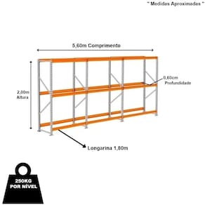 Kit Mini Porta Pallet 2250kg 1 inicial 2 Continuações 5,60m Comprimento 2,00m x 1,80m x 60cm O Mini Porta Pallet é produzido em aço resistente, com capacidade de 250kg por Nível e reforço nas laterais é indicado para depósitos, estoques e exposição, como: pet shops, oficinas, lojas de materiais de construção e mini atacarejos. Prático e versátil dispensa o uso de empilhadeiras, onde as mercadorias são depositadas e retiradas manualmente. Além disso, é de fácil montagem, com a simples colocação de porcas e parafusos, unindo as longarinas às colunas. A pintura dos produtos é feita por meio da técnica eletrostática, com tratamento anticorrosão uniforme e resistente. Os Mini Porta Pallets possuem qualidade, resistência e durabilidade garantidas pelo uso de matérias-primas de alto padrão, processos produtivos com a mais alta tecnologia do mercado e um cuidado especial em cada etapa de produção. Dimensões Aproximadas Altura: 2,00mProfundidade: 0,60mComprimento Longarina: 1,80m Comprimento Total Montada: 5,60m " Medida Aproximada "Características Material: AçoMarca: AmapáCor: Cinza/LaranjaCapacidade por Nível: 250kgPeso Total Suportado: 2250kgFornecedor: Mixmob Instalações Comerciais Contém 04 Laterais 2,00m x 0,60m - Amapá09 Pares Longarinas 1,80m x 0,60m - Amapá Entrega Via: TransportadoraPrazo: Consulte pelo CEP com nossos vendedores Garantia Contra Defeitos de Fabricação: 12 meses DevoluçãoEm até 7 dias após a chegada do produto, você tem o direito de realizar a devolução. Mas para isso, a mercadoria não deve ter sido montada, utilizada e danificada.Horário de AtendimentoSegunda a Sexta-feira, das 13:00h às 17:00h.Dúvidas, Informações, Consulte Nossos Vendedores Via WhatsApp.\nFicha Técnica\nCódigo MPPK1I2C\ncódigo de barras 7899119800334\nModelo Linha Mini Porta Pallet 250kg\nCategoria Mini Porta Pallet Amapá\nMarca Amapá Metalúrgica\nItens Inclusos 04 Laterais 2,00m x 0,60m - Amapá09 Pares Longarinas 1,80m x 0,60m - Amapá\nGarantia 1 ano após o recebimento do produto\nDisponibilidade Disponível em 2 dias úteis\nInformação adicional Dúvidas, Informações, Consulte Nossos Vendedores Via WhatsApp.