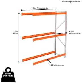Mini Porta Pallet 250kg Continuação 2,00m x 1,20m x 0,60cm Amapá O Mini Porta Pallet é produzido em aço resistente, com capacidade de 250KG POR NÍVEL e reforço nas laterais é indicado para depósitos, estoques e exposição, como: pet shops, oficinas, lojas de materiais de construção e mini atacarejos. Prático e versátil dispensa o uso de empilhadeiras, onde as mercadorias são depositadas e retiradas manualmente. Além disso, é de fácil montagem, com a simples colocação de porcas e parafusos, unindo as longarinas às colunas. A pintura dos produtos é feita por meio da técnica eletrostática, com tratamento anticorrosão uniforme e resistente. Os Mini Porta Pallets possuem qualidade, resistência e durabilidade garantidas pelo uso de matérias-primas de alto padrão, processos produtivos com a mais alta tecnologia do mercado e um cuidado especial em cada etapa de produção. A Fileira de MINI PORTA PALLETS deve ser iniciada com o Mini Porta Pallet INICIAL que possui 2 colunas. O Mini Porta Pallets CONTINUAÇÃO possui 1 coluna, utilizada para dar continuidade à fileira e não pode ser montada individualmente. Dimensões Aproximadas Altura: 2,00mProfundidade: 60cm Comprimento Longarina: 1,20m Comprimento Total: 1,25m " Medida Aproximada " Características Material: AçoMarca: AmapáCor: Cinza/LaranjaModelo: Mpp 250kg AmapáCapacidade Peso Por Nível: 250kgCapacidade Peso Total Suportado: 750kgFornecedor: Mixmob Instalações Comerciais Mini Porta Pallet CONTINUAÇÃO possui 01 Lateral, utilizado para dar continuidade à fileira e não pode ser montado individualmente. Contém 01 Lateral 2,00m x 0,60m - Amapá03 Pares Longarinas 1,20m x 0,60m - Amapá Entrega Via: TransportadoraPrazo: Consulte pelo CEP com nossos vendedoresGarantia Contra Defeitos de Fabricação: 12 Meses DevoluçãoEm até 7 dias após a chegada do produto, você tem o direito de realizar a devolução. Mas para isso, a mercadoria não deve ter sido montada, utilizada e danificada.Horário de AtendimentoSegunda a Sexta-feira, das 13:00h às 17:00h.Dúvidas, Informações, Consulte Nossos Vendedores Via WhatsApp.\nFicha Técnica\nCódigo AMP065\ncódigo de barras 7899119800310\nModelo Linha Mini Porta Pallet 250kg\nCategoria Mini Porta Pallet Amapá\nMarca Amapá Metalúrgica\nItens Inclusos 01 Lateral 2,00m x 0,60m - Amapá03 Pares Longarinas 1,20m x 0,60m - Amapá\nGarantia 1 ano após o recebimento do produto\nDisponibilidade Disponível em 2 dias úteis\nInformação adicional Dúvidas, Consulte Nossos Vendedores Via WhatsApp.