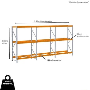 Kit Mini Porta Pallet 500kg 1 Inicial + 2 Continuações 3,80m Comprimento 2,00m x 1,20m x 80cm O Mini Porta Pallet é produzido em aço resistente, com capacidade de 500kg por nível e reforço nas laterais é indicado para depósitos, estoques e exposição, como: pet shops, oficinas, lojas de materiais de construção e mini atacarejos. Prático e versátil dispensa o uso de empilhadeiras, onde as mercadorias são depositadas e retiradas manualmente. Além disso, é de fácil montagem, com a simples colocação de porcas e parafusos, unindo as longarinas às colunas. A pintura dos produtos é feita por meio da técnica eletrostática, com tratamento anticorrosão uniforme e resistente. Os Mini Porta Pallets possuem qualidade, resistência e durabilidade garantidas pelo uso de matérias-primas de alto padrão, processos produtivos com a mais alta tecnologia do mercado e um cuidado especial em cada etapa de produção. Dimensões Aproximadas Altura: 2,00mProfundidade: 0,80mComprimento Longarina: 1,20m Comprimento Montada: 3,80m "Media Aproximada"Características Material: AçoMarca: AmapáCor: Cinza/LaranjaCapacidade por Nível: 500kgCapacidade Peso Total: 4500kg Mini Porta Pallet Inicial possui 02 laterais, indispensável para iniciar uma fileira. Mini Porta Pallet Continuação possui 01 lateral, utilizado para dar continuidade à fileira e não pode ser montado individualmente. Contém 04 Laterais 2,00m x 0,80m - Amapá09 Pares Longarinas 1,20m x 0,80m – Amapá Entrega Via: TransportadoraPrazo: Consulte pelo CEP com nossos vendedoresGarantia Contra Defeitos de Fabricação: 12 meses DevoluçãoEm até 7 dias após a chegada do produto, você tem o direito de realizar a devolução. Mas para isso, a mercadoria não deve ter sido montada, utilizada e danificada.Horário de AtendimentoSegunda a Sexta-feira, das 13:00h às 17:00h.Dúvidas, Informações, Consulte Nossos Vendedores Via WhatsApp.\nFicha Técnica\nCódigo 1331\nModelo Linha Mini Porta Pallet 500kg\nCategoria Mini Porta Pallet Amapá\nMarca Amapá Metalúrgica\nItens Inclusos 04 Laterais 2,00m x 0,80m - Amapá09 Pares Longarinas 1,20m x 0,80m Amapá\nGarantia 1 ano após o recebimento do produto\nDisponibilidade Disponível em 2 dias úteis\nInformação adicional Dúvidas, Informações, Consulte Nossos Vendedores Via WhatsApp.