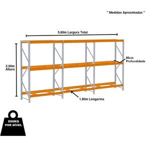 Kit Mini Porta Pallet 500kg 1 Inicial + 2 Continuações 5,60m Comprimento - 2,00m x 1,80m x 0,80cm O Mini Porta Pallet é produzido em aço resistente, com capacidade de 500kg por nível e reforço nas laterais é indicado para depósitos, estoques e exposição, como: pet shops, oficinas, lojas de materiais de construção e mini atacarejos. Prático e versátil dispensa o uso de empilhadeiras, onde as mercadorias são depositadas e retiradas manualmente. Além disso, é de fácil montagem, com a simples colocação de porcas e parafusos, unindo as longarinas às colunas. A pintura dos produtos é feita por meio da técnica eletrostática, com tratamento anticorrosão uniforme e resistente. Os Mini Porta Pallets possuem qualidade, resistência e durabilidade garantidas pelo uso de matérias-primas de alto padrão, processos produtivos com a mais alta tecnologia do mercado e um cuidado especial em cada etapa de produção. A Fileira de MINI PORTA PALLETS deve ser iniciada com o Mini Porta Pallet INICIAL que possui 2 colunas. O Mini Porta Pallets CONTINUAÇÃO possui 1 coluna, utilizada para dar continuidade à fileira e não pode ser montada individualmente. Dimensões Aproximadas Altura: 2,00mProfundidade: 0,80mComprimento Longarina: 1,80m Comprimento Total: 5,60m "Media Aproximada"Características Material: AçoMarca: AmapáCor: Cinza/LaranjaCapacidade por Nível: 500kgCapacidade Peso Total: 4500kg Mini Porta Pallet Inicial possui 02 laterais, indispensável para iniciar uma fileira. Mini Porta Pallet Continuação possui 01 lateral, utilizado para dar continuidade à fileira e não pode ser montado individualmente. Contém 04 Laterais 2,00m x 0,80m - Amapá09 Pares Longarinas 1,80m x 0,80m – Amapá Entrega Via: TransportadoraPrazo: Consulte pelo CEP com nossos vendedoresGarantia Contra Defeitos de Fabricação: 12 meses DevoluçãoEm até 7 dias após a chegada do produto, você tem o direito de realizar a devolução. Mas para isso, a mercadoria não deve ter sido montada, utilizada e danificada.Horário de AtendimentoSegunda a Sexta-feira, das 13:00h às 17:00h.Dúvidas, Informações, Consulte Nossos Vendedores Via WhatsApp.\nFicha Técnica\nCódigo AMP041\nModelo Linha Mini Porta Pallet 500kg\nCategoria Mini Porta Pallet Amapá\nMarca Amapá Metalúrgica\nItens Inclusos 04 Laterais 2,00m x 0,80m - Amapá09 Pares Longarinas 1,80m x 0,80m Amapá\nGarantia 1 ano após o recebimento do produto\nDisponibilidade Disponível em 2 dias úteis\nInformação adicional Dúvidas, Informações, Consulte Nossos Vendedores Via WhatsApp.
