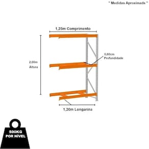 Mini Porta Pallet 500Kg Continuação 2,00m x 1,20m x 0,60cm O Mini Porta Pallet é produzido em aço resistente, com capacidade de 500 kg por nível e reforço nas laterais é indicado para depósitos, estoques e exposição, como: pet shops, oficinas, lojas de materiais de construção e mini atacarejos. Prático e versátil dispensa o uso de empilhadeiras, onde as mercadorias são depositadas e retiradas manualmente. Além disso, é de fácil montagem, com a simples colocação de porcas e parafusos, unindo as longarinas às colunas. A pintura dos produtos é feita por meio da técnica eletrostática, com tratamento anticorrosão uniforme e resistente. Os Mini Porta Pallets possuem qualidade, resistência e durabilidade garantidas pelo uso de matérias-primas de alto padrão, processos produtivos com a mais alta tecnologia do mercado e um cuidado especial em cada etapa de produção.A Fileira de MINI PORTA PALLETS deve ser iniciada com a Mini Porta Pallet INICIAL que possui 2 colunas. O Mini Porta Pallet CONTINUAÇÃO possui 1 coluna, utilizada para dar continuidade à fileira e não pode ser montada individualmente. Dimensões Aproximadas Altura: 2,00mProfundidade: 0,60mLargura Longarina: 1,20m Comprimento Total: 1,25m " Medida Aproximadas " Características Capacidade por Nível: 500 kgCapacidade Total 1500kgCor: Cinza/LaranjaMaterial: Aço Mini Porta Pallet Continuação possui 01 lateral, utilizado para dar continuidade à fileira e não pode ser montado individualmente. Contém 01 Lateral 2,00m - Amapá03 Pares Longarinas 1,20m x 0,60m - Amapá Entrega Via: TransportadoraPrazo: Consulte pelo CEP Com nossos vendedores Garantia Contra Defeitos de Fabricação: 12 meses Dúvidas, Informações, consulte nossos Vendedores Via WhatsApp.\nFicha Técnica\nCódigo AMP0352\nModelo Linha Mini Porta Pallet 500kg\nCategoria Mini Porta Pallet Amapá\nMarca Amapá Metalúrgica\nItens Inclusos 01 Lateral 2,00m - Amapá03 Pares Longarinas 1,20m x 0,60m - Amapá\nGarantia 1 ano após o recebimento do produto\nDisponibilidade Disponível em 3 dias úteis
