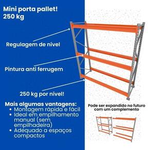 Prático e versátil, o mini porta pallet é ideal para depósitos, estoques e exposição de mercadorias. Com capacidade de peso de 250kg por nível, esse produto é perfeito para pet shops, oficinas, lojas de materiais de construção e mini atacarejos.