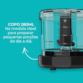 - Compacto e eficiente - Corta, processa, moe e tritura - 70w de potência - Lâminas de aço inox - Capacidade: 280ml - Consumo: 0,070 kWh/mês - Trava de segurança - Selo de Segurança OCP SGS Dimensões aproximadas do produto s/ embalagem: 11,8x12,6x17,5cm (AxLxP) Peso aproximado do produto s/ embalagem: 650gPorta-fio