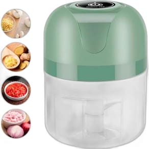 Mini processador de alimentos portátil com 3 lâminas de aço inoxidável, ideal para triturar alho, temperos e outros alimentos. Possui capacidade de 250ml e é fácil de limpar, sendo à prova d'água (IPX8).Acessórios