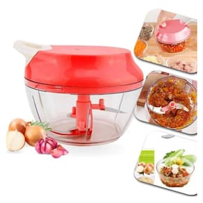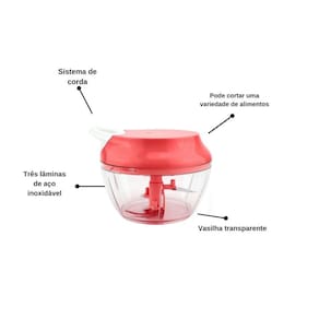 Mini processador manual com lâminas afiadas em aço inox, acionamento por corda retrátil e base antiderrapante. Ideal para fatiar verduras, legumes, frutas, ervas e grãos.Acessórios