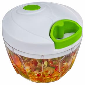 Triturador manual de alimentos 3 lâminas O triturador e processador de alimentos manual é super prático e fácil de usar, basta colocar o alimento na tigela transparente, inserir a lâmina no centro da tigela, tampar, travar e tracionar o puxador algumas vezes até o alimento ser triturado. Triture em segundos alhos, tomates, cebolas, pimentas, pimentões, folhas e uma enorme variedade de legumes e vegetais.- Medidas: 13 cm (largura) x 10 cm (altura) x 13 cm (comprimento).