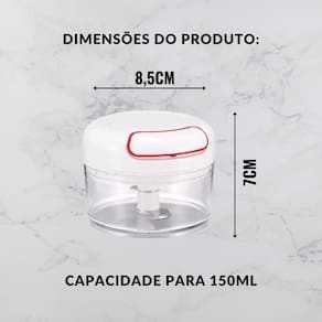 Mini processador manual de temperos com capacidade de 150 ml. Feito em plástico, na cor incolor e branco. Medidas: 8,5cm x 7,0cm (largura x altura). Peso líquido: 151 gramas.Acessórios