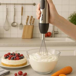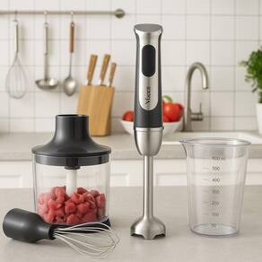 Mixer com haste inox, Copo medidor de 650ml, Batedor tipo fouet, Mini processador chopperPorta-fio