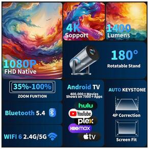 Sua estrutura rotativa de 180° e correção automática de keystone ajustam o ângulo de projeção, com roda de foco e zoom digital de 35% a 100%, suportando proporção de tela 1.3:1 em distâncias de 0,6 m a 2,5 m e tamanhos de imagem de 89 cm a 305 cm de diagonal. O alto-falante integrado e vida útil da fonte de luz de 30.000 horas facilitam uso em home theater doméstico ou portátil. Recomenda-se superfície estável e sinal WiFi estável para desempenho ideal.
