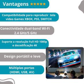 Principais perguntas sobre o produto e respostas: 1 consigo conectar vídeo game nele Sim, consegue usar como reprodução para vídeo games de todas as versões com saída hdmi. 2 consigo conectar hd externo Sim, basta plugar o hd na entrada usb. 3 conexa com celular Sim, via entrada usb. 4 posso conectar caixa de som Sim, apesar dele ter uma caixa de som embutida é possível conectar uma caixa de som pois o aparelho possuí saída p2. 5 vem com netflix instalada Sim, para logar é necessário entrar na conta google e logar a sua conta na netflix 6 consigo baixar outros aplicativos Sim, o projetor possui sistema android como um celular portanto é possível baixar programas na playstore. Homologação Anatel: 112572013224 Marca: Não Informado