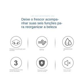 Ficha técnica; -Método de cabeça de agitar: tremendo a cabeça para cima e para baixo -Escolha do vento: vento ajustável -Função de temporização: sem tempo -Capacidade do tanque de água: menos de 1 litro -Frequência nominal: 60 -Engrenagem de velocidade do vento: 3 -Potência nominal: 7W -Tensão nominal: 5V -Modo de operação: mecânico -Modo de fonte de alimentação: USB -Ruído: abaixo de 36dB - Material: Abs, Pc - Cor: Branco com Cinza -Tipo de interruptor: botão de piano - Dimensões Aproximadas: 17 x 16 x 14,5cm (A x C x L)
