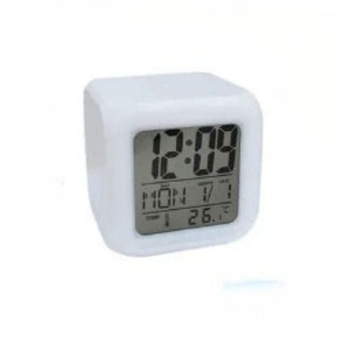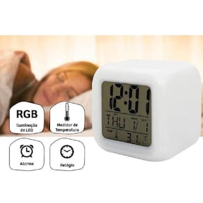 Mini Relógio Despertador Digital Branco Um item indispensável para quem busca praticidade, tecnologia e um toque de estilo no dia a dia. Com um design compacto, elegante e inteligente, ele é perfeito para ser no quarto, escritório, sala ou até mesmo em ambientes estudantis. Seu display digital em LED oferece excelente visibilidade, com iluminação colorida que muda automaticamente por ciclos ou com um simples toque, criando um ambiente mais agradável e personalizado. Além disso, o relógio conta com diversas funcionalidades integradas: marca as horas com precisão, exibe a data completa, o dia da semana e a temperatura ambiente, ideal para manter você sempre bem informado. Possui ainda a útil função soneca, permitindo alguns minutinhos extras de descanso antes de começar o dia. Simples de usar e altamente eficiente, o despertador funciona com 3 pilhas AAA (não inclusas) e é fabricado com materiais de qualidade como plástico resistente e componentes eletrônicos duráveis Especificações: Dimensões: 8cm altura x 8cm largura x 8cm comprimento Composição: Plástico, Vidro e Componentes Eletrônicos Alimentação: 3 Pilhas AAA (não inclusas) Peso: 88g Cor: Branca