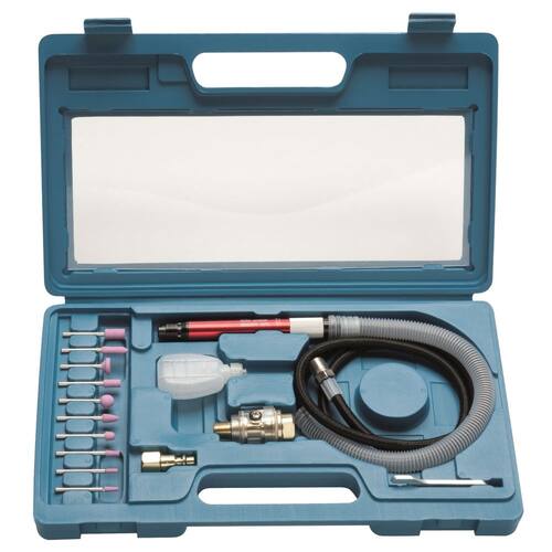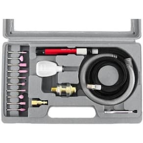 A Mini Retífica Esmeril de Ar Pneumático do tipo caneta com 16 peças, é utilizada para furar, afiar, lixar, cortar, polir, lustrar, gravar, esmerilhar e muito mais. Marca: Gudcraft Características: -Composição: Alumínio e ferro. -Velocidade máxima: 56000Rpm livres. -Regulador de velocidade embutido. -Mangueira de ar revestida de 1,5m. -Pressão de ar: 90Psi. -Consumo de ar: 2 cfm. -Vem com engate rápido de 1/4. -haste das pontas montadas: 1/8". -Entrada de ar: 1/4NPT. -Mangueira de ar: 3/8". Conteúdo: -1 Mini retifica esmeril de ar pneumático. -1 Mini almotolia. -1 Porta óleo. -2 Chaves. -1 Nipple. -10 Pontas montadas -Acompanha caixa plástica. Aplicação: Ideal para trabalhos manuais, artesanatos e hobby que necessitam furar, afiar, lixar, cortar, polir, lustrar, entalhar, esmerilhar, gravar e limpar. Código: 9GQ Ean: 7895315013622