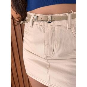 A saia é uma minissaia de cor clara, bege claro, com cintura alta. O tecido jeans. A peça tem costuras pespontadas que se destacam e bolsos frontais falsos ou discretos. Ela é complementada por um cinto fino de cor semelhante, com fivela prateada. Marca: Não Informado