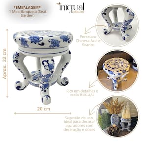 Mini Seat Garden Azul E Branco Banqueta 22cm Decoração Mesa Mini Seat Garden em Porcelana Azul e Branco - Decoração Sofisticada Transforme seus ambientes com o charme e a versatilidade do Mini Seat Garden em porcelana azul e branco. Com design clássico inspirado na tradição oriental, ele é a peça ideal para compor mesas, aparadores, racks ou até mesmo servir como base de vasos e esculturas. Além de funcional, o Mini Seat Garden é um item de destaque na decoração, trazendo sofisticação, elegância e personalidade para qualquer espaço.
