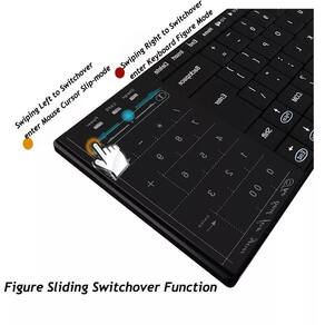 -movendo dedo do ponto médio para a esquerda, ativa o modo de função do mouse -movendo o dedo do ponto médio para a direita, ativa o modo numérico do teclado -bluetooth 3.0 -teclado sem fio -opera em frequência de 2,480ghz -tempo de carregamento: 4 horas -número de teclas: 83 teclas + 18 teclas no touchpad -cor: preto ou branco -carregamento via cabo usb -idioma: inglês