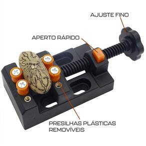 Mini Torno de Bancada Preto Morsa Vise Ajustável para Pequenos Objetos Micro Retífica Dremax - Marca: Dremax - Referência: MTV01P - Cor: Preto e Laranja - Comprimento aberto: 180mm - Abertura máxima: 55mm - Ideal para travar pequenos objetos para trabalhos de precisão com micro retíficas e trabalhos manuais - Roletes plásticos para não danificas as peças a serem trabalhadas - Botão de trava para ajuste rápido - Material: Plástico ABS - : 90 dias contra defeitos de fabricação A DREMAX é a primeira e única marca brasileira dedicada exclusivamente às micro retíficas, acessórios e acoplamentos para esta indispensável ferramenta. Seja para trabalhos de precisão, artesanato, modelagem ou reparos, a DREMAX tem o produto certo para você. Marca: Não Informado Ean: 7734625989831