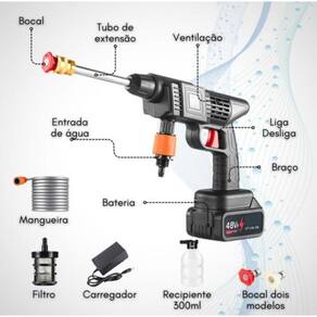Adquira agora mesmo e descubra uma forma prática e eficiente de realizar a limpeza de diferentes superfícies. Produto perfeito para quem busca facilidade e praticidade na hora de realizar a limpeza de diversos locais, como garagens, carros, motos, bicicletas etc.Vantagens: Compacta e leve permitindo você levar para onde precisar, sem depender de uma tomada próxima. Não precisa de torneira por perto, você pode conectar diretamente à mangueira ou basta encher um balde com água, colocar a peça de captação de água e o motor fará o resto do trabalho. A lavadora é recarregável, não possui fio. Punho de uso fácil, como se fosse uma furadeira.Características da lava jato:- cor: preto- tensão da bateria: 48 v.- carregador: bivolt pode usar no 110v ou 220v .- material: plástico abs + componentes eletrônicos.- potência: 1000w.- tempo de carga: 3 horas.- tamanho da mangueira de acoplar: 4 metros.- carga de fluxo de água: 4 litros/min.Itens inclusos:1 lavadora portátil1 bateria de lítio 48 v.1 carregador de bateria1 mangueira aprox. 5 mts 2 modelos de ponteiras1 tubo de extensão1 filtro1 reservatório para sabão 300 ml1 conector de mangueira