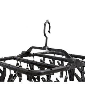 Características: - contém 26 prendedores de roupa. - possui suporte para ser pendurado. - dobrável. - cor: preto. - economiza espaço. - material leve e prático. - fácil armazenamento. - dimensões: 01 varal a 27cm x l 32,5cm x p 33cm, com 4 correntinhas, 1 suporte e 26 prendedores. - suporta: 0,500 kg - composição: estrutura do produto: polipropileno / mola: aço