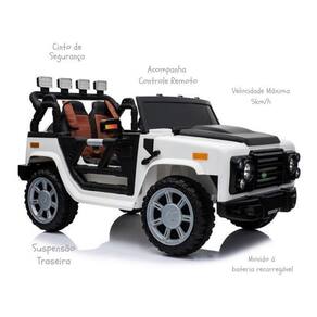 Com esse super Jipe seu pequeno vai de divertir de montão Um mini veículo elétrico com várias funções para a brincadeira do seu pequeno ficar ainda mais divertida Esse Jipe conta com cinto de segurança, sons de buzina, entrada USB, luz, entrada para cartão de memória, um completo painel e ainda possui controle remoto. Com esse lindo Jipe a diversão está garantida