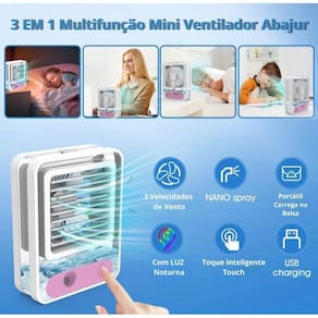 - refresca de verdade - 1 saídas de spray com 3 níveis de controle. - controle de velocidade com 3 opções. - ajuste de até 60º posição do vento. - capacidade de 600ml de água. - funciona partir de uma tomada usb certificar que seja de 2a ou superior para melhor desempenho .