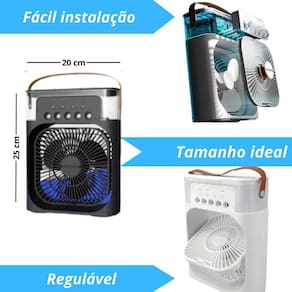 Posso regular a intensidade do vento Resposta: sim, ele tem a opção de 3 velocidades. Qual é a voltagem dele Resposta: ele é bivolt, funciona em todos os locais do brasil. O produto possui função sleep desligamento automático Resposta: sim, tem um timer com a função para programar 1, 2 ou 3 horas para desligar. Ele é giratório Resposta: sim, ele pode ser posicionado manualmente para cima e para baixo. O produto consome muita energia Resposta: não, o produto exige pouca energia para funcionamento. Qual a quantidade de água suportada em seu recipiente Resposta: a capacidade do mini climatizador de ar é de 600ml. Qual é o alcance da ventilação Resposta: o alcance gira em torno de 5 metros, mas o mesmo climatiza o ar quando o ambiente está fechado. Marca: AL