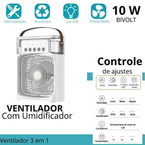 Principais perguntas sobre o produto e respostas: 1 posso regular a intensidade do vento Resposta: sim, ele tem a opção de 3 velocidades. 2 qual é a voltagem dele Resposta: ele é bivolt, funciona em todos os locais do brasil. 3 o produto possui função sleep desligamento automático Resposta: sim, tem um timer com a função para programar 1, 2 ou 3 horas para desligar. 4 ele é giratório Resposta: sim, ele pode ser posicionado manualmente para cima e para baixo. 5 o produto consome muita energia Resposta: não, o produto exige pouca energia para funcionamento. 6 qual a quantidade de água suportada em seu recipiente Resposta: a capacidade do mini climatizador de ar é de 600ml. 7 qual é o alcance da ventilação Resposta: o alcance gira em torno de 5 metros, mas o mesmo climatiza o ar quando o ambiente está fechado. Marca: Não Informado Ean: 7904263820517