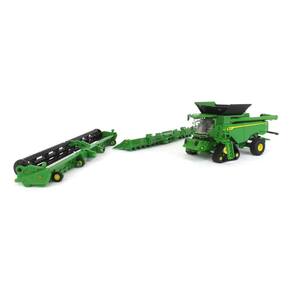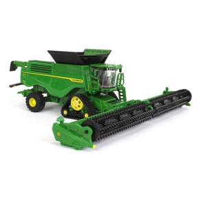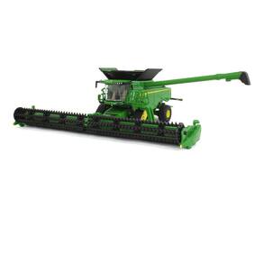 Feito por ERTL Parte da coleção Prestige da ERTL Vem com cabeçote de draper HD50F intercambiável e cabeçote de milho dobrável C16F Corpo de metal fundido Esteiras de borracha rolantes Trado de descarga dobrável Escada frontal pivotante Grades Espelhos de cabine