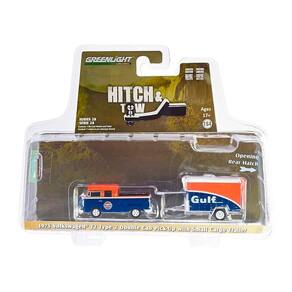 Este conjunto da Greenlight, parte da linha Hitch & Tow – Série 28, apresenta a clássica Volkswagen Kombi T2 de cabine dupla de 1975 acompanhada por um reboque pequeno de carga, ambos em escala 1:64. O modelo destaca-se pela pintura azul e pela atenção aos detalhes da época, representando com fidelidade a popular van que marcou gerações.
