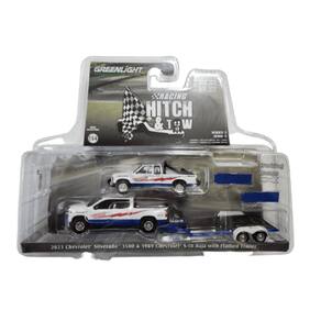 Greenlight – 2023 Chevy Silverado 1500 + 1989 Chevy S-10 Baja com Flatbed Trailer Branco (Racing Hitch & Tow Série 5 – Escala 1:64)