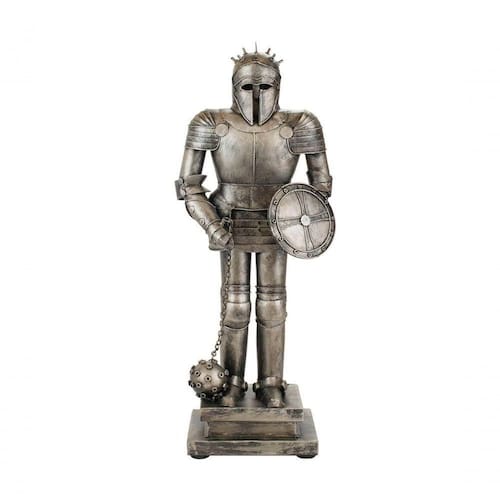 Enfeite decorativo no formato de uma armadura medieval prateada de 44.5 cm de altura com escudo redondo e um mangual. Produto exclusivamente com função decorativa. Material: metal