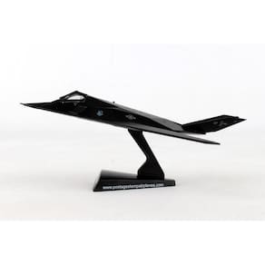 O f-117 nighthawk é um avião furtivo de ataque ao solo de assento único e bimotor operado pela força aérea dos estados unidos. sua tecnologia icônica e revolucionária permitiu que ele atacasse seus oponentes sendo praticamente indetectável. o nighthawk passou grande parte de sua vida útil envolta em sigilo, até que foi reconhecido e revelado ao mundo em novembro de 1988. Este modelo de avião de metal fundido vem em escala 1:150 com suporte de plástico e tem aproximadamente 5 1/ 2 polegadas de comprimento com 3 1/2 polegada de envergadura.