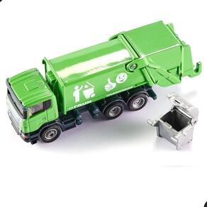 Corpo traseiro totalmente basculante para descarregar o lixo. Mecanismo de elevação funcional para a lixeira. Acompanha uma lixeira de brinquedo Siku. Pneus de borracha que garantem um deslize suave.