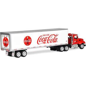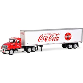 Detalhes realistas: Inclui logotipos da Coca-Cola nas laterais do caminhão trator e do trailer, maçancas cromadas, retrovisores cromados, pneus de borracha macia com banda de rodagem e antena no teto do caminhão trator.