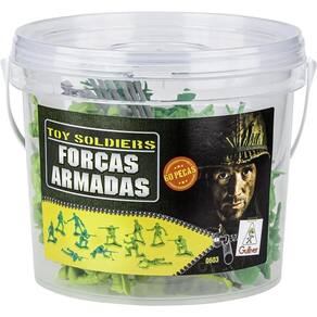 Balde Forças Armadas Figuras Coloridas Gulliver. Conjunto com 60 Miniaturas de Soldados de Exército brasileiros, em diferentes posições de batalha e 4 Cercados. Em Balde de 2,2 litros, para você poder guardar as peças e levar para onde quiser. Viva esta emoção de ajudar nossos Soldados em uma missão secreta.