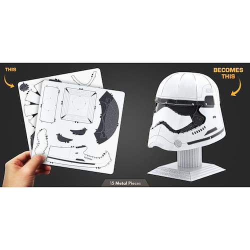 Peças pré-cortadas e fáceis de montar: As peças da miniatura são cortadas com precisão em folhas de metal finas, dispensando a necessidade de ferramentas especiais e tornando a montagem acessível para pessoas de todas as idades e níveis de habilidade. Design intrincado e cheio de detalhes: O capacete é composto por diversas peças que se encaixam perfeitamente, reproduzindo com fidelidade os detalhes característicos do capacete dos Stormtroopers da Primeira Ordem, como as ranhuras de respiração, a viseira e os tubos de comunicação. Instruções claras e passo a passo: Um manual de instruções detalhado acompanha a miniatura, guiando você passo a passo na montagem do capacete, garantindo um processo divertido e sem frustrações.