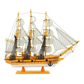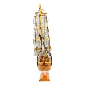 Enfeite no formato de miniatura de barco navio veleiro com 38 cm de altura, 6 cm de largura e 43 cm de comprimento. Modelo se destaca com base do casco do navio na cor branca. Vem com suporte para ficar em posição. Material: madeira; Função exclusivamente decorativa