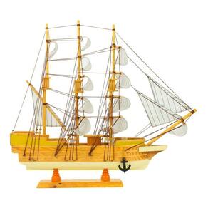 Enfeite no formato de miniatura de barco navio veleiro com 38 cm de altura, 6 cm de largura e 43 cm de comprimento. Modelo se destaca com base do casco do navio na cor bege. Vem com suporte para ficar em posição. Material: madeira; Função exclusivamente decorativa