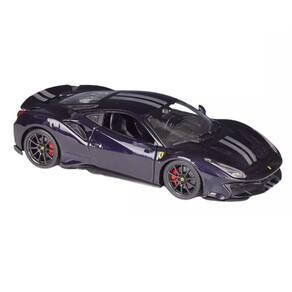 A miniatura da Ferrari 488 Pista é uma réplica detalhada e precisa do carro esportivo de alta performance em escala reduzida. Na cor vermelha, a miniatura apresenta um acabamento brilhante que reflete a luz de forma realista. Os detalhes da pintura são retratados com precisão, incluindo as faixas esportivas e as logomarcas da Ferrari.