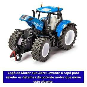 Construído sobre um chassi de metal robusto, este modelo foi feito para durar e impressionar. A icônica cor azul da New Holland é reproduzida com perfeição, e cada detalhe, desde a cabine envidraçada até os pneus de borracha com sulcos realistas, foi pensado para satisfazer os colecionadores mais exigentes e os jovens entusiastas do agronegócio.