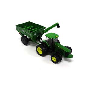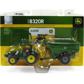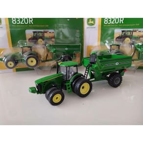 O trator ERTL John Deere 8320R com carrinho de grãos possui pneus dianteiros e traseiros duplos, e o sem-fim gira para descarregar os grãos no elevador. Também possui um corpo fundido robusto com um eixo dianteiro fundido oscilante. O carrinho de grãos tem uma estrutura fundida e uma caixa que pode suportar o abuso.