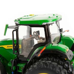 Configuração Imponente: O grande destaque são os rodados duplos nos eixos dianteiro e traseiro, com pneus de borracha macia e rodas detalhadas. Escala de Prestígio: A escala 1:32 (Aprox. 20cm C x 15cm L x 12cm A) oferece um tamanho ideal para exibição de detalhes. Construção Premium: Corpo e chassi fabricados em metal fundido (die-cast), garantindo uma peça robusta e duradoura. Cabine Ultra Detalhada: Interior completo com assento do operador, painel de controle, monitores, alavancas e volante, tudo visível através de janelas cristalinas. Funcionalidades Avançadas: Rodas dianteiras direcionáveis (esterçam), engate traseiro de três pontos que levanta e abaixa, e capô que abre para revelar um motor detalhado. Detalhes Autênticos: Espelhos retrovisores, luzes de sinalização, antena de GPS no teto e os icônicos gráficos da John Deere aplicados com perfeição.